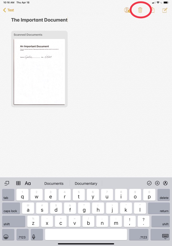 You can keep your scanned document in the Notes app in case you might need it again or want to retain it for your records. If you do, I suggest adding a title to the top of the note so you can more easily find it later: