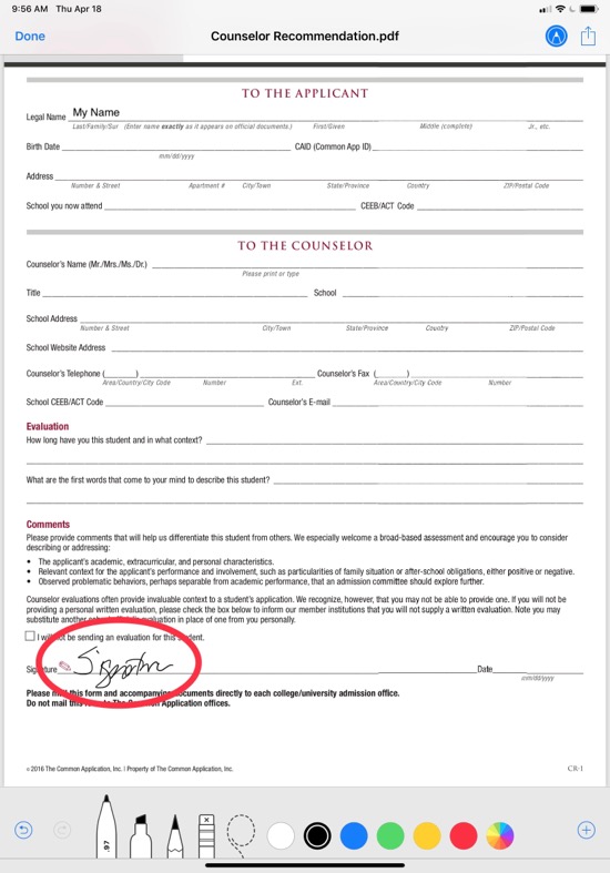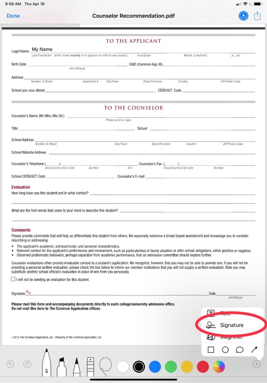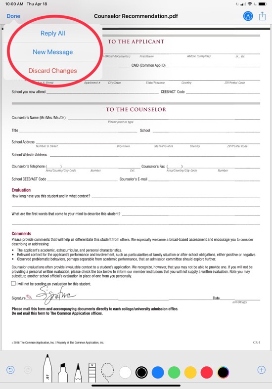 To sign the form, tap the Mark Up button in the toolbar in the upper right corner to bring up the mark-up tools. (Note: if the toolbar is hidden, tap on the form to show it).