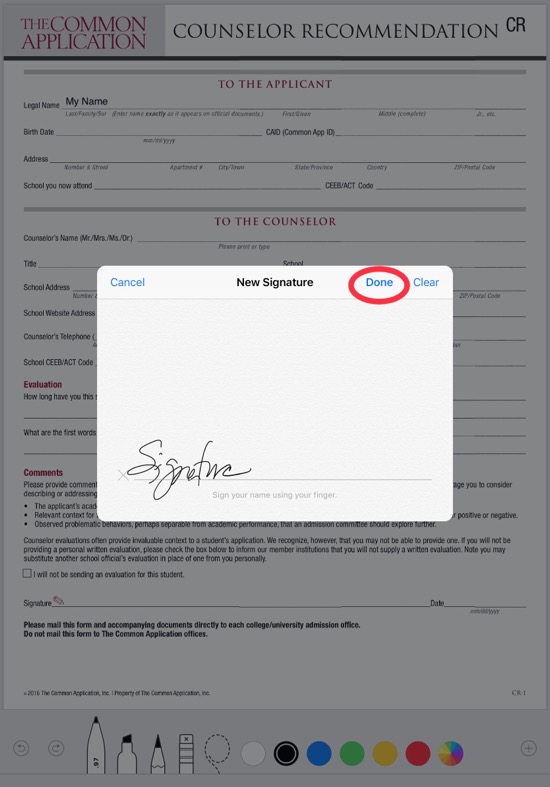 If you’ve never created a signature before, use your finger or the Apple Pencil to sign where indicated, and then tap Done. This will insert your signature onto the form and save it for use again later: