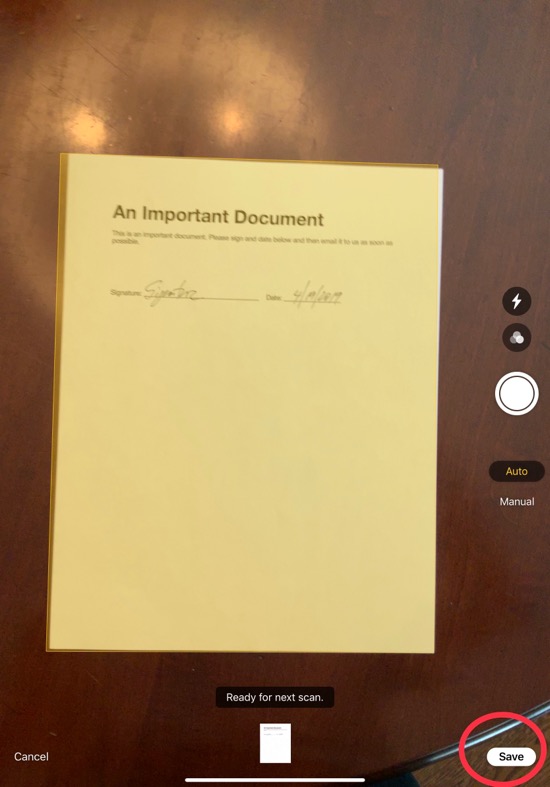 If you have more than one page, keep taking scans in the same manner and each page will all be added to the same document. Once you’ve finished, tap Save: