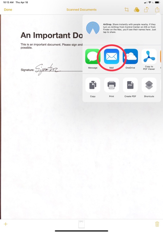 The Notes app has a built-in document scanner that makes it easy to scan a paper document to create a PDF, and then send it through email.