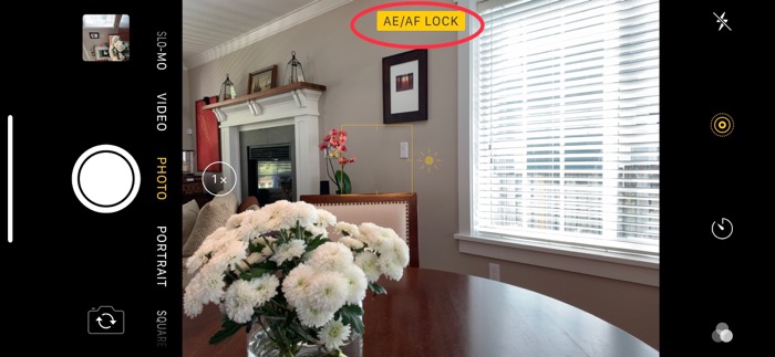 To lock focus and exposure, tap and hold the subject area. The focus box will pulse and the camera will show AE/AF LOCK to indicate that auto-exposure and auto-focus have been locked: