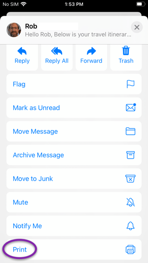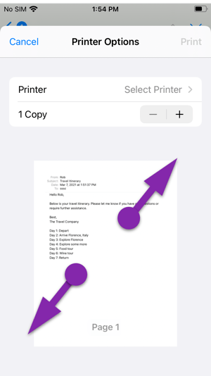 To return to the email, on iPhone, tap the back arrow in the upper left of the screen, or on iPad, tap Done, and then tap Cancel from the Print page.