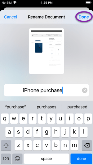 You can give the file a name that will help you more easily find it later by tapping in the file name box and typing the name you’d like to use. Then tap Done.