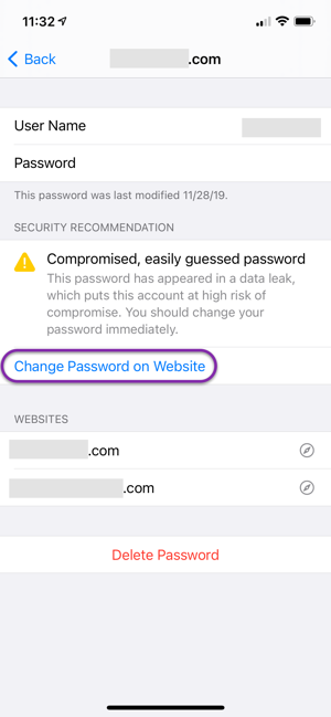 The recommendations list shows you sites that share a password. For each of these, tap Change Password on Website to jump to the site and let your device create a strong, unique password for each one.