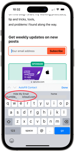 The next time you’re on a website where you’ve created a Hide My Email address, when you tap into the email address field, the keyboard will suggest your Hide My Email address, making it easy to log in with your new address: