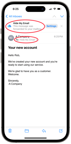 Emails sent to one of your Hide My Email addresses will be delivered to your normal inbox, along with your other email. These emails will indicate that they were sent to a Hide My Email address: